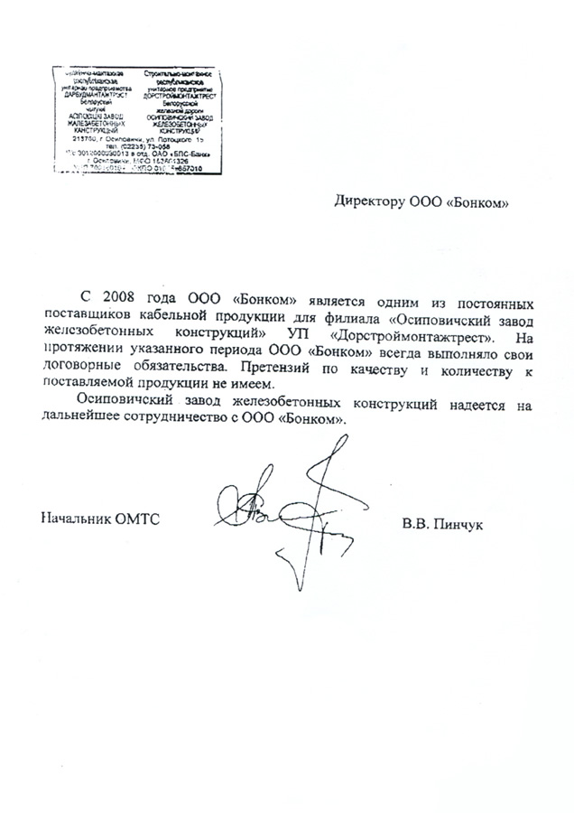 С 2008 года ООО «Бонком» является одним из постоянных поставщиков кабельной продукции для филиала «Осиповичский завод железобетонных конструкций» УП «Дорстроймонтажтрест». На протяжении указанного периода ООО «Бонком» всегда выполняло свои договорные обязательства. Претензий по качеству и количеству к поставляемой продукции не имеем.